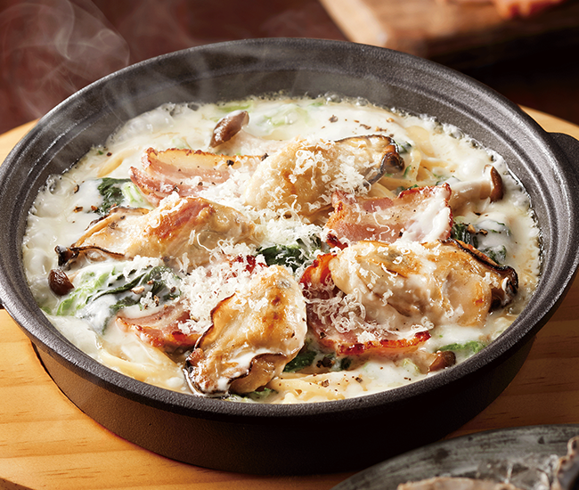 チーズが絡んだパスタを焼き上げ、牡蠣とベーコンの旨みがとけ込んだソースで仕上げた熱々鉄板パスタは、寒い時期のごちそうです。