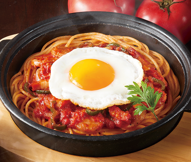パスタ専門店のナポリタンは、酸味のあるトマトソースが食欲を刺激します。おこげもおいしい、熱々パスタをどううぞ。