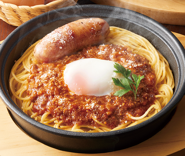 “鉄板パスタ” 粗挽きソーセージと半熟卵のミートソース