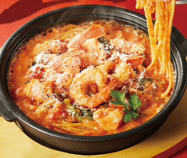 “鉄板パスタ” ずわい蟹と赤エビのトマトクリームソース