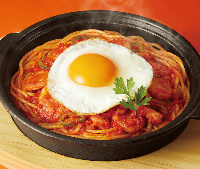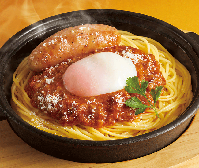 “鉄板パスタ” 粗挽きソーセージと半熟卵のミートソース