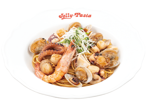 エビ、岩だこ、帆立、イカ、あさりをつかい、コクのある醤油ソースで仕上げたパスタ。香味野菜でさっぱりと。